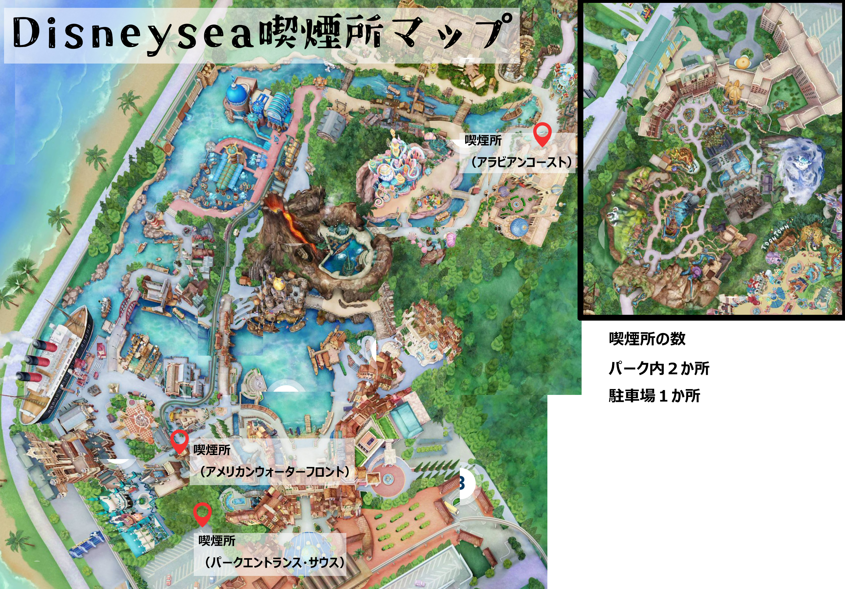 ディズニーシーでの喫煙所は撤去されたのか、どこが減ったのか、現在の喫煙所マップを作製してみました。