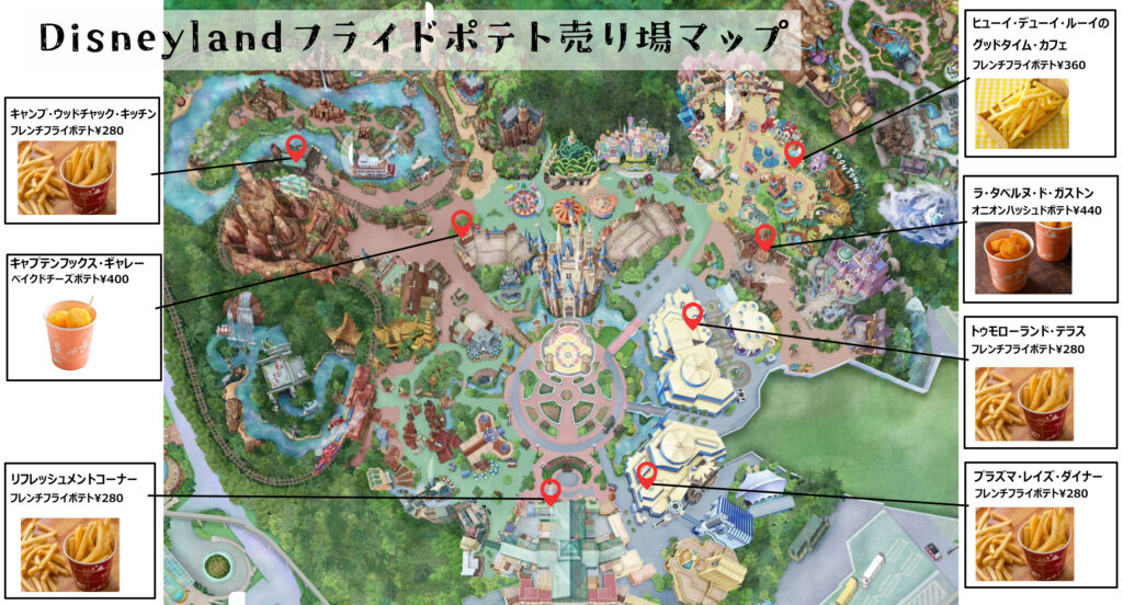 ディズニーランドのフライドポテト(フレンチフライポテト)販売場所の売り場マップ