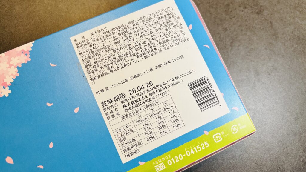 濃い抹茶こっこ(砂糖(国内製造)、鶏卵、小麦粉、ファットスプレッド、食用油脂、乳等を主要原料とする食品、抹茶、食塩/膨張剤、乳化剤、加工デンプン、香料、ソルビトール、着色料(紅花黄、クチナシ、カロチン)、増粘多糖類、酸化防止剤(V.E)、(一部に小麦・卵・乳成分・大豆を含む))