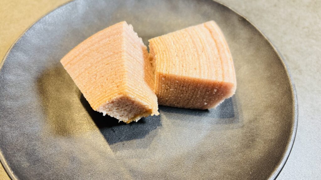 治一郎のバームクーヘンの季節限定の桜バウムクーヘンは、桜餅のようなあまじょっぱさのある味でした。